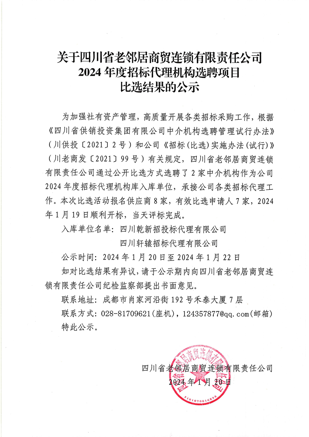 四川省老鄰居商貿(mào)連鎖有限責(zé)任公司2024年貨架采購項目公開招標(biāo)中標(biāo)公告(招標(biāo)編號:SCXYZB-2024-103
